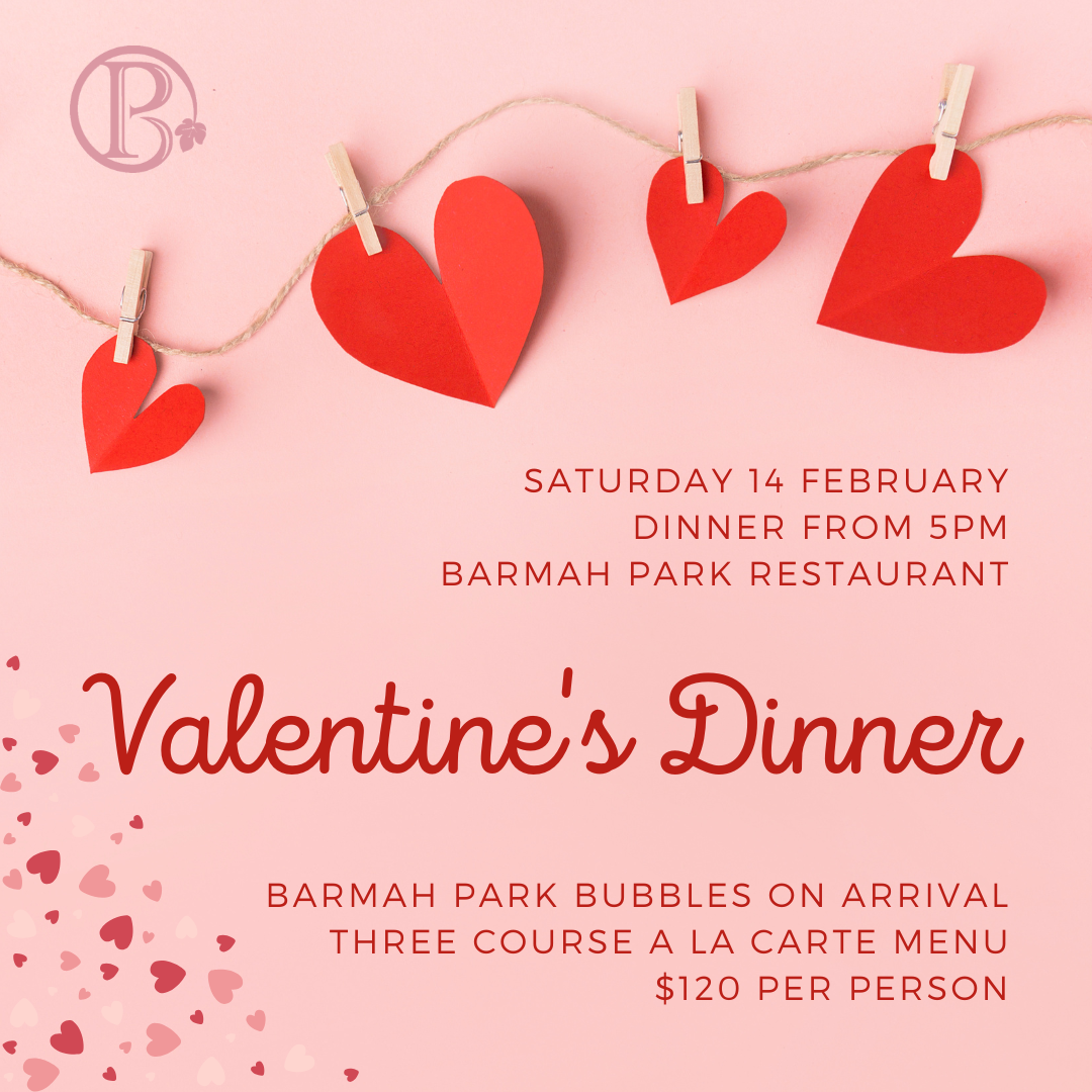 We are presenting a three course dinner with glass of Barmah Park Cuvee Blanc on arrival for $120 per person.